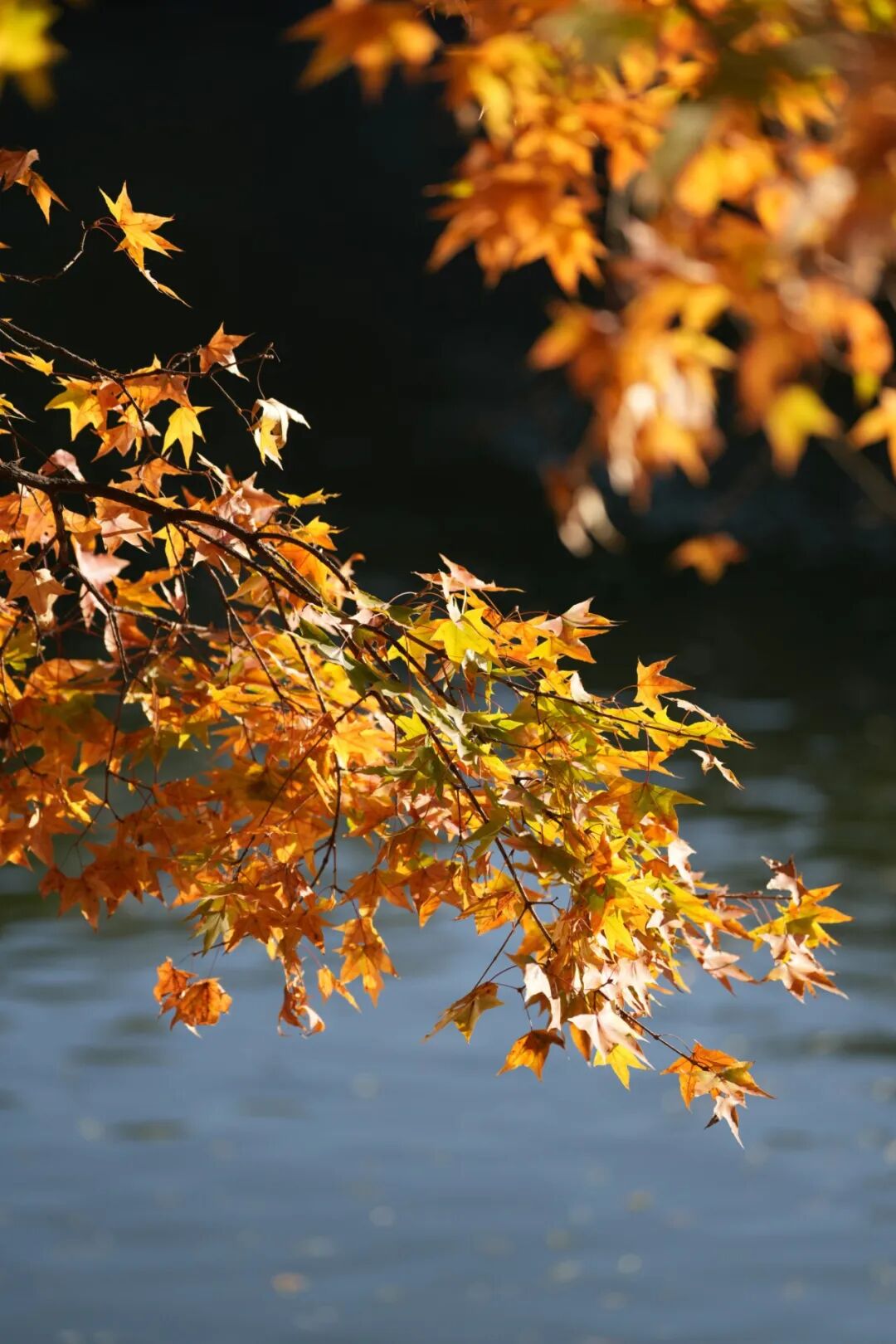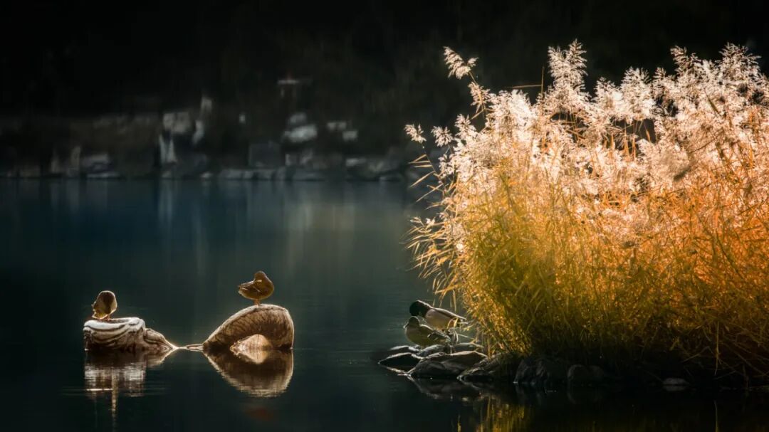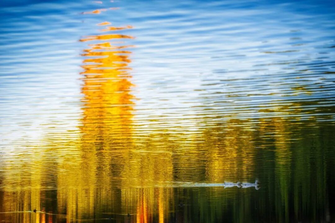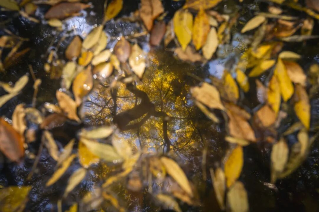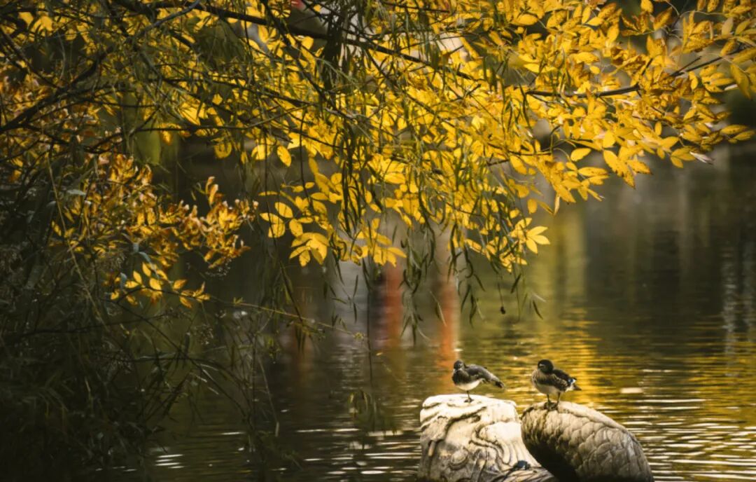 倒映着枫红菊艳、叶舞金辉